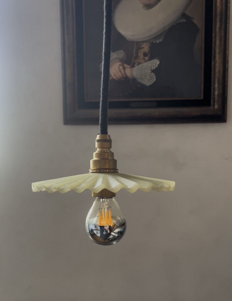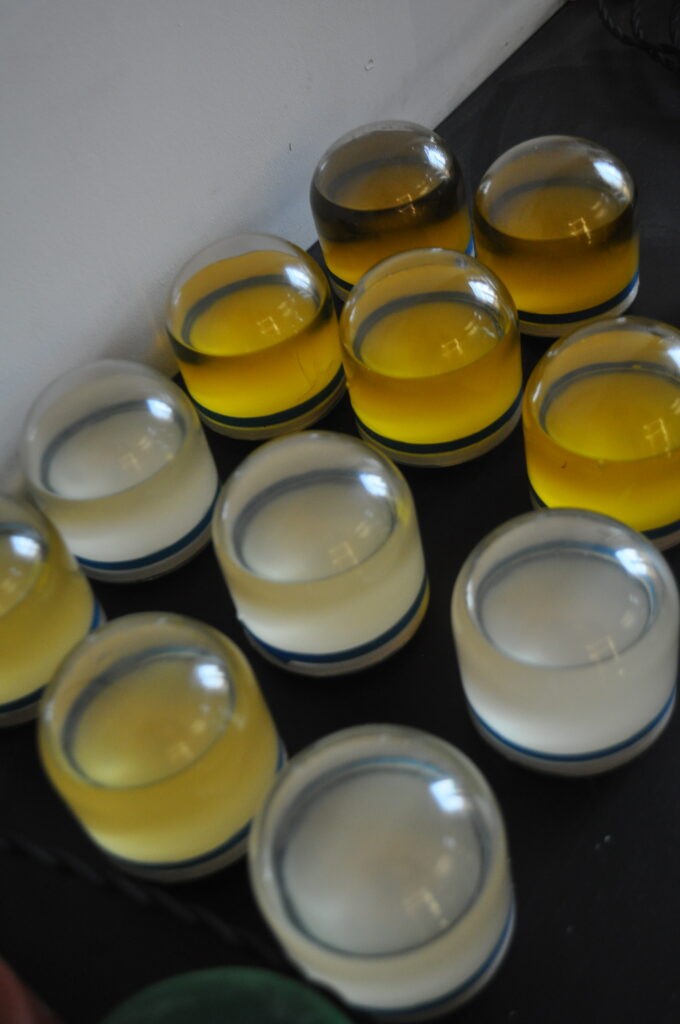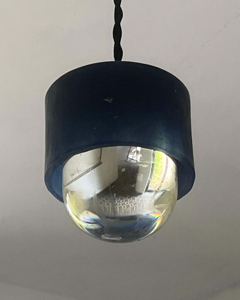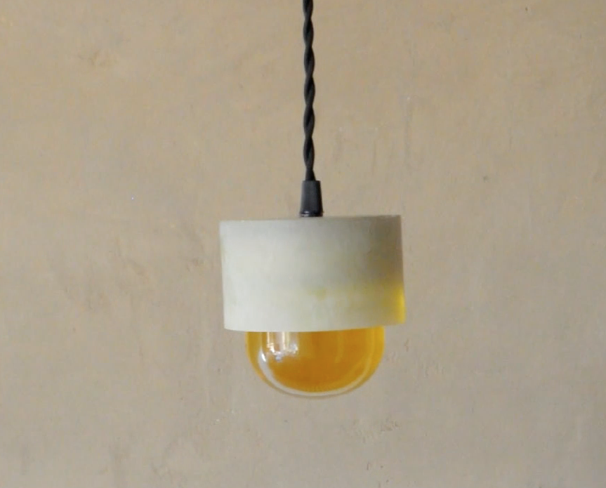 Het ontwerp van deze lampen oogt om minimalistisch en zacht. Onderin zit een bol reservoir dat gevuld is met olie (van mais tot olijf), als je er inkijkt krijg je het effect van een bolle spiegel van de kamer eronder reflecteert. Het licht wordt gebundeld en getint door de olie.