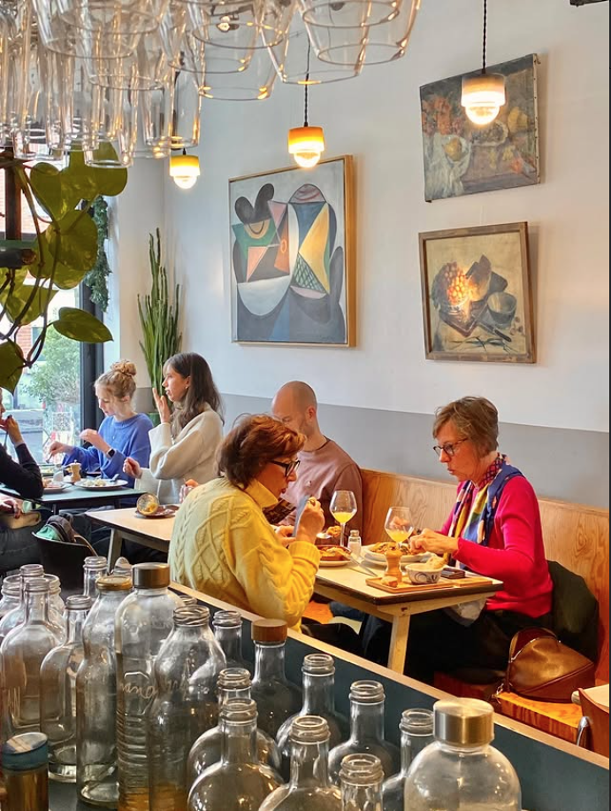 Boven te toog hangen lampen die gebaseerd zijn franse horeca verlichting uit vorige eeuw.